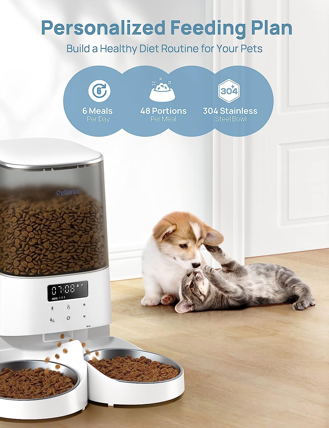 • Spoil Your fur Baby: Rellorus pet feeder can be set up to 6 meals per day and 1-48 portions per meal (8g/0.28oz each portion), customized a healthy diet for your pets. The cat feeder also equipped with a “Feed Now” option to easily reward your pet and give an extra meal.