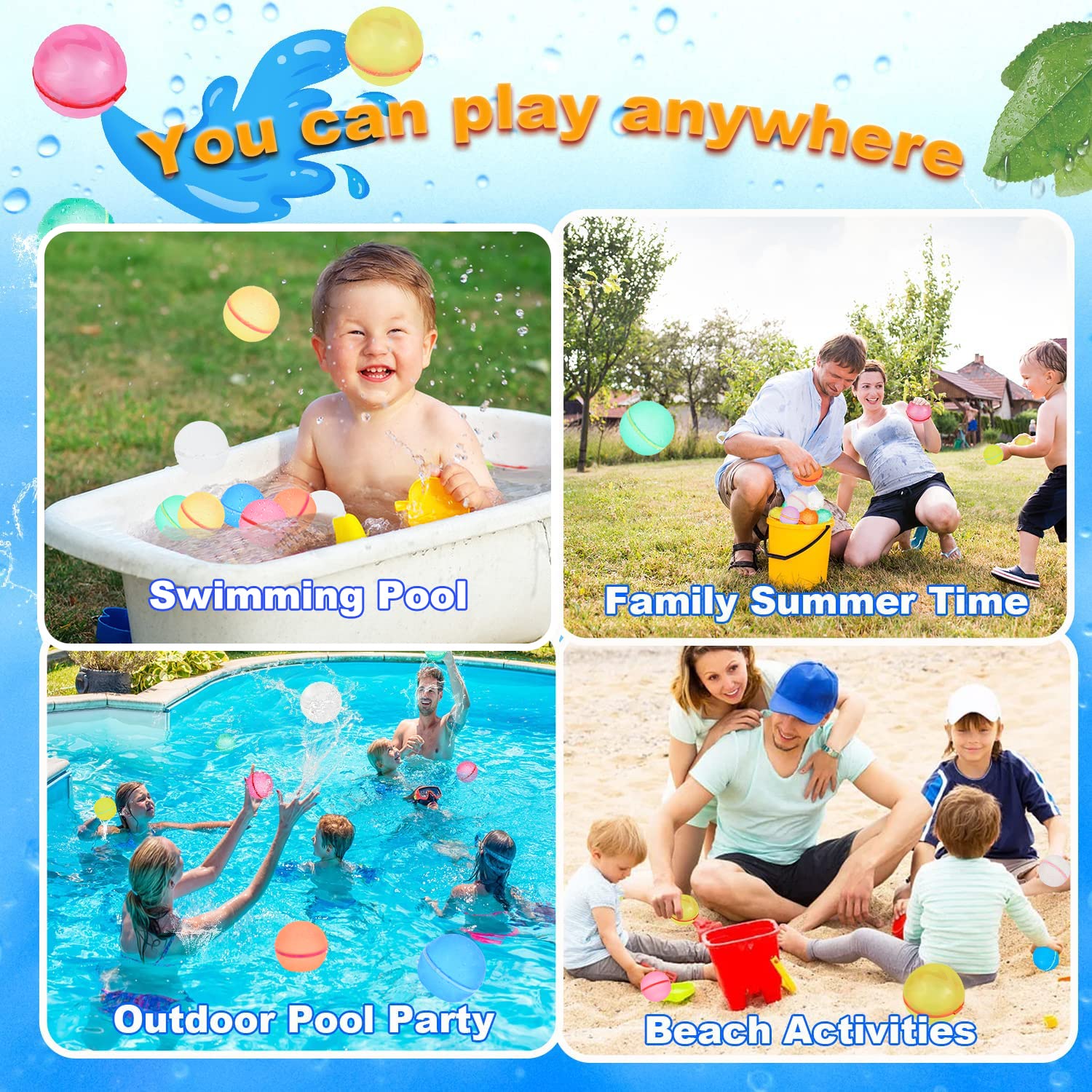 • 【Reusable Water Balloons】Skip the lines at the hose, and stop worrying about cleaning up tiny pieces of rubber once the fight is finished. Reusable Water Bombs achieve the same drenching effect as a balloon with no mess
